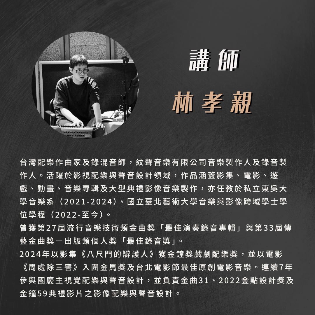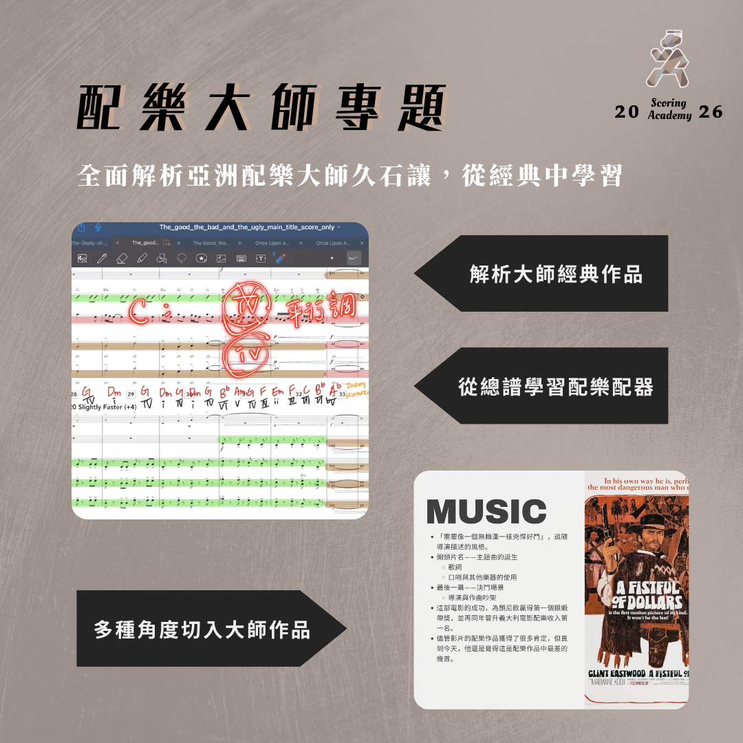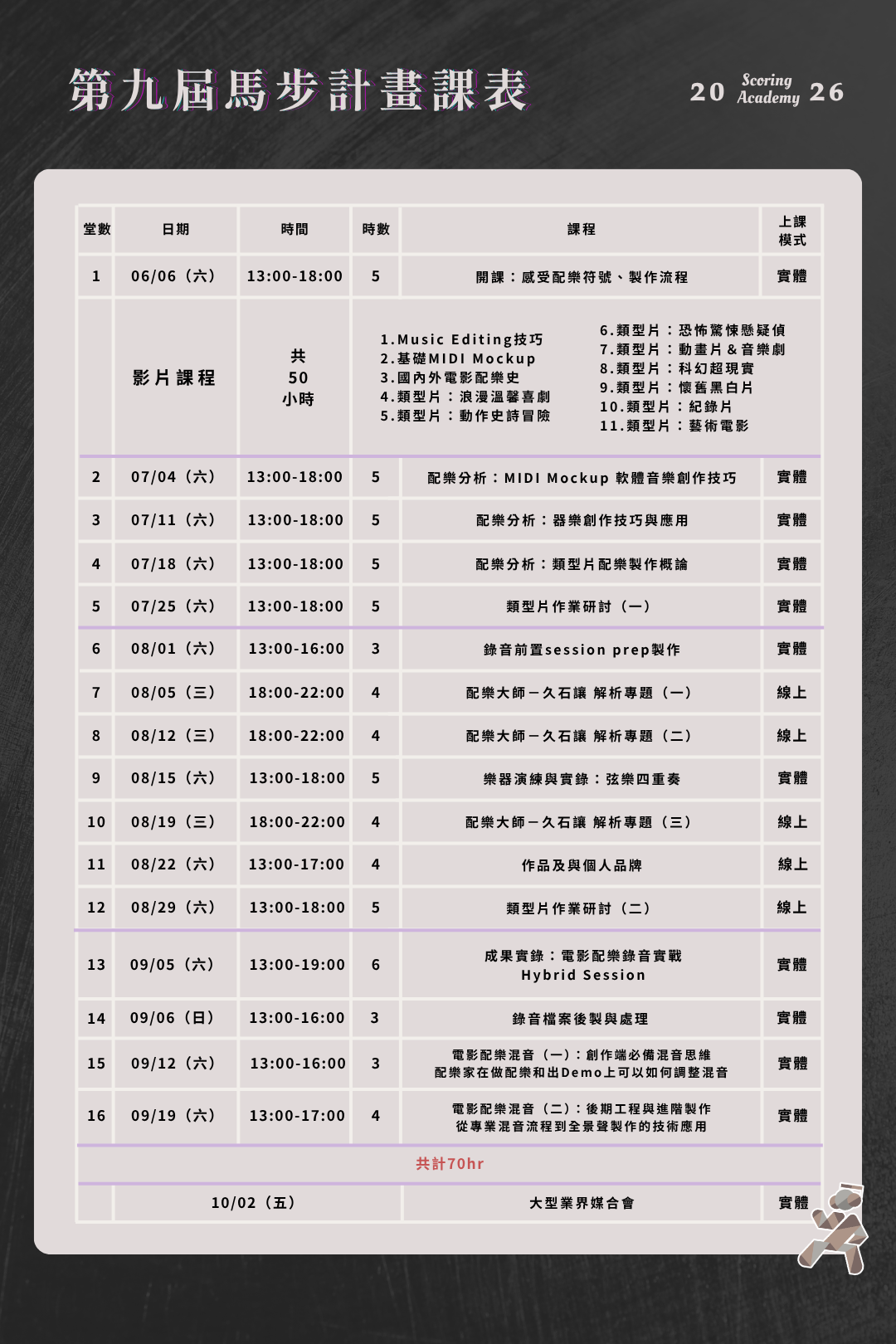 第九屆課程延續過往架構,並針對學習節奏與內容配置進行調整, 將重心放在配樂能力的整合與實際產出,