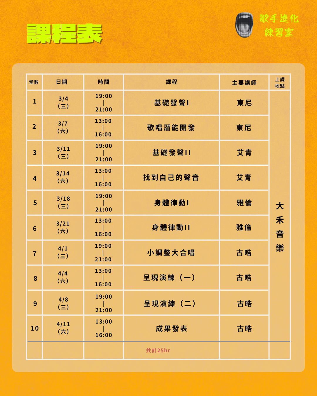 想讓自己的歌聲更穩定、更有表情?或是喜歡唱歌、希望找到新的啟發與樂趣?這堂課,適合任何想要讓歌聲與表達更完整的人。三位專業歌唱教練、一位肢體表演老師十堂課讓你唱作俱佳!打造全能歌手的進化之路,由此展開!透過聲形合一,釋放潛能,讓世界看見全新的你!我們的師資群,將帶你由內而外地蛻變,從聲音到肢體,感受..